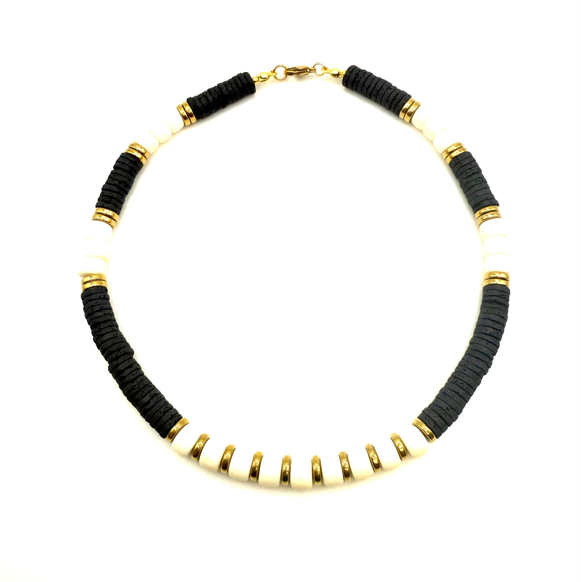 This elegant handcrafted necklace features a refined mix of natural black and ivory-toned stones, accented with delicate gold spacer beads for a timeless, elevated look. The alternating cylindrical and round beads create beautiful texture and contrast, making it an effortless piece for everyday wear or layering.
