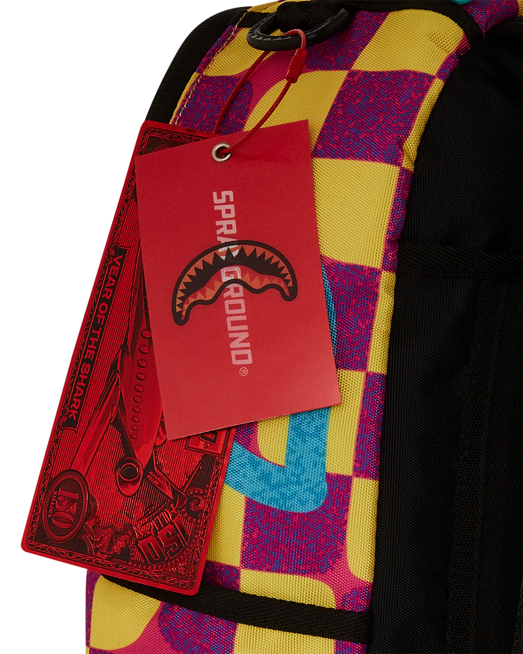 Dimensions: 18" x 6" x 11.5" • Front zipper pocket • Side pockets • Zippered Stash pocket • Separate velour sunglass compartment • Ergonomic mesh back padding • Adjustable Straps for custom sizing • Gold zippers with metal hardware • Metal "Sprayground Authentic" badge • Slide through back sleeve connects to carry-on luggage to free your hands